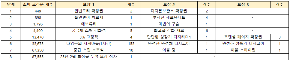 - 이벤트 기간 동안 크라운 누적 사용량에 따라 단계 보상을 획득할 수 있습니다.