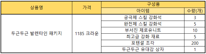 ※ 구성품 중 [두근두근 유대감 상자] 에서는 유대감 증가 물약 중 1종을 랜덤으로 획득 가능합니다.