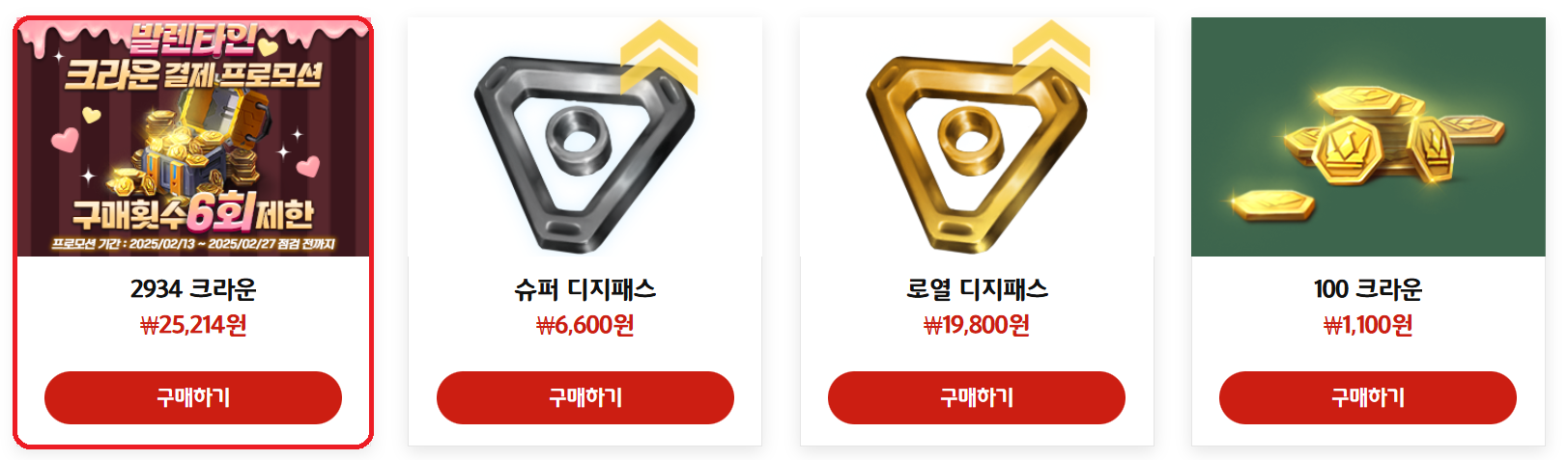 크라운 결제 프로모션 상품은 [공식 홈페이지] - [상점]에서 확인 가능합니다.
