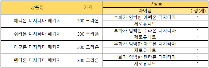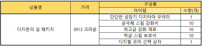 ※ 디지털 코어 선택 상자 구성품(5% 고정책x2, 쿠즈하몬의 제사도구x1, 홀리 링x5, 신수의 힘 선택상자x1, 비진화의 의지x1, 개조파츠 부품 선택상자x2, 강인한 그랜쿠가몬의 디지코어x1) 중 1종 선택 가능합니다.