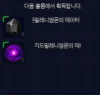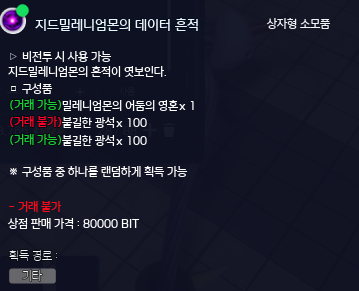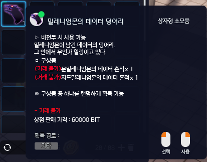 - 밀레니엄몬의 데이터 덩어리에서 구성품 2가지 중 랜덤하게 획득이 가능합니다.