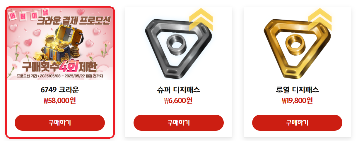 크라운 결제 프로모션 상품은 [공식 홈페이지] - [상점]에서 확인 가능합니다.