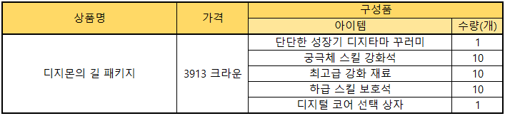 ※ 디지털 코어 선택 상자 구성품(5% 고정책x2, 쿠즈하몬의 제사도구x1, 홀리 링x5, 신수의 힘 선택상자x1, 비진화의 의지x1, 개조파츠 부품 선택상자x2, 강인한 그랜쿠가몬의 디지코어x1) 중 1종 선택 가능합니다.