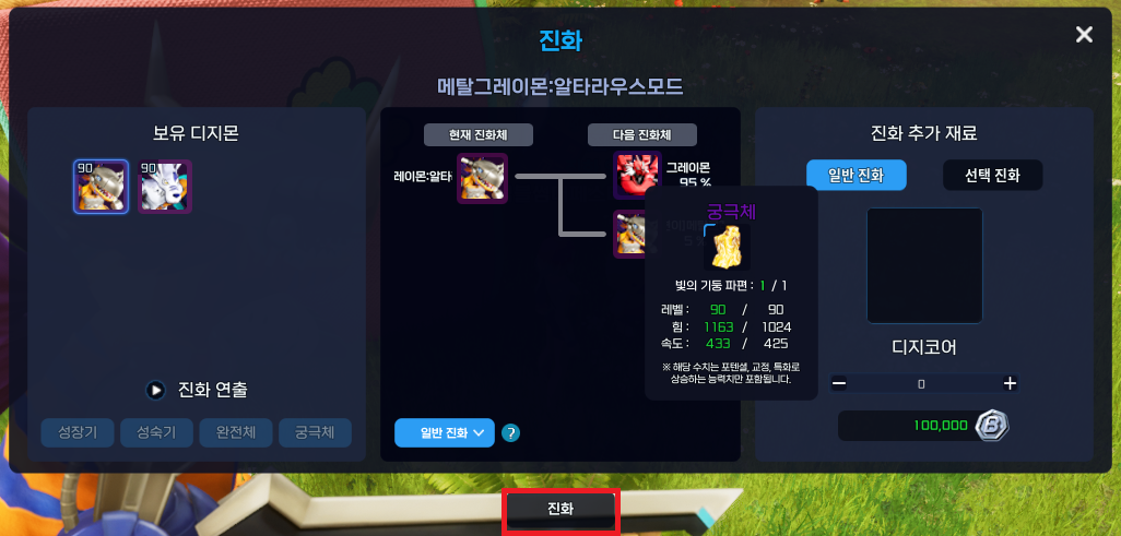 - 진화 조건을 충족한 상태에서 진화 버튼 클릭!