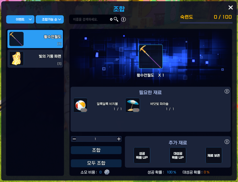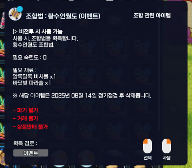 - 2개의 조합법과 7일차 보상 아이템인 '알록달록 비치볼'과 '바닷빛 파라솔'을 모두 획득하였다면,