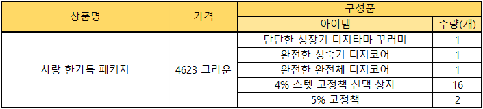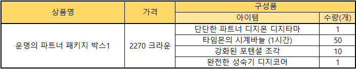 ※ 디지털 코어 선택 상자 구성품(5% 고정책x2, 쿠즈하몬의 제사도구x1, 홀리 링x5, 신수의 힘 선택상자x1, 비진화의 의지x1, 개조파츠 부품 선택상자x2, 강인한 그랜쿠가몬의 디지코어x1) 중 1종 선택 가능합니다.
