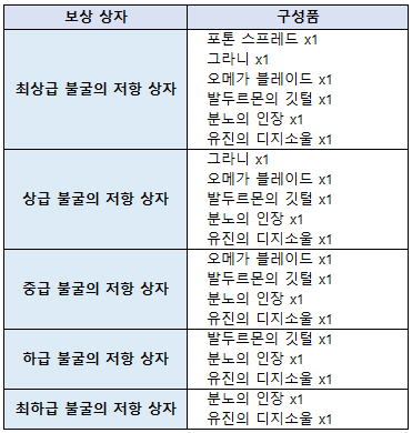 * 불굴의 보상 상자 구성품 중 택 1 가능하며, 구성품은 모두 거래 가능입니다.