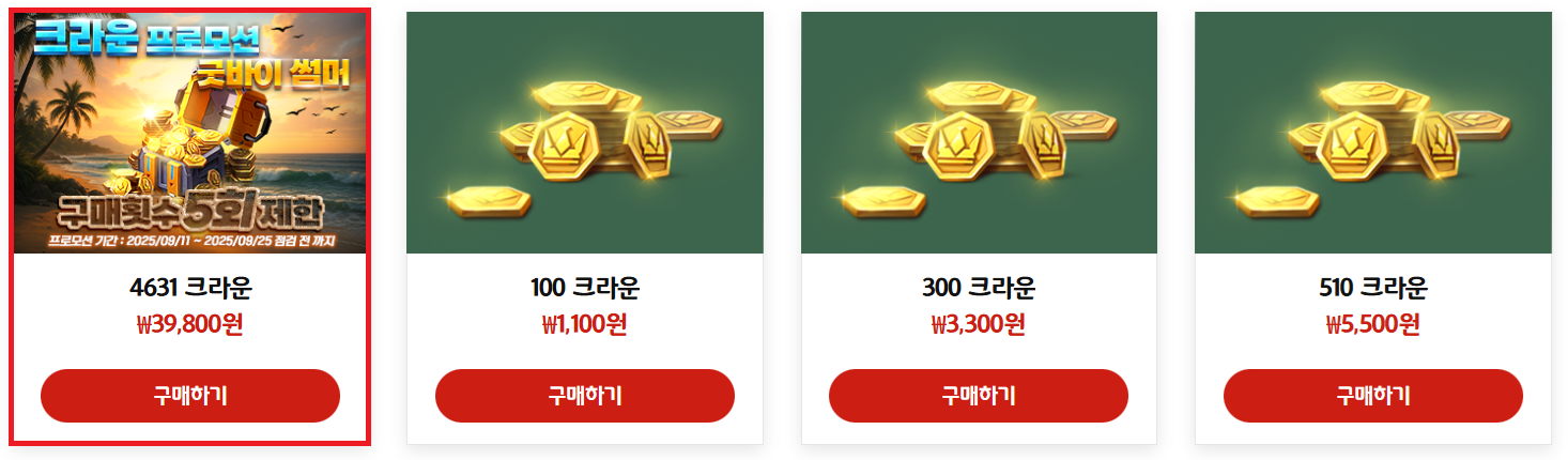 크라운 결제 프로모션 상품은 [공식 홈페이지] - [상점]에서 확인 가능합니다.