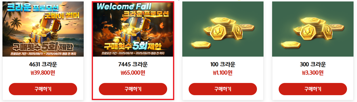 크라운 결제 프로모션 상품은 [공식 홈페이지] - [상점]에서 확인 가능합니다.