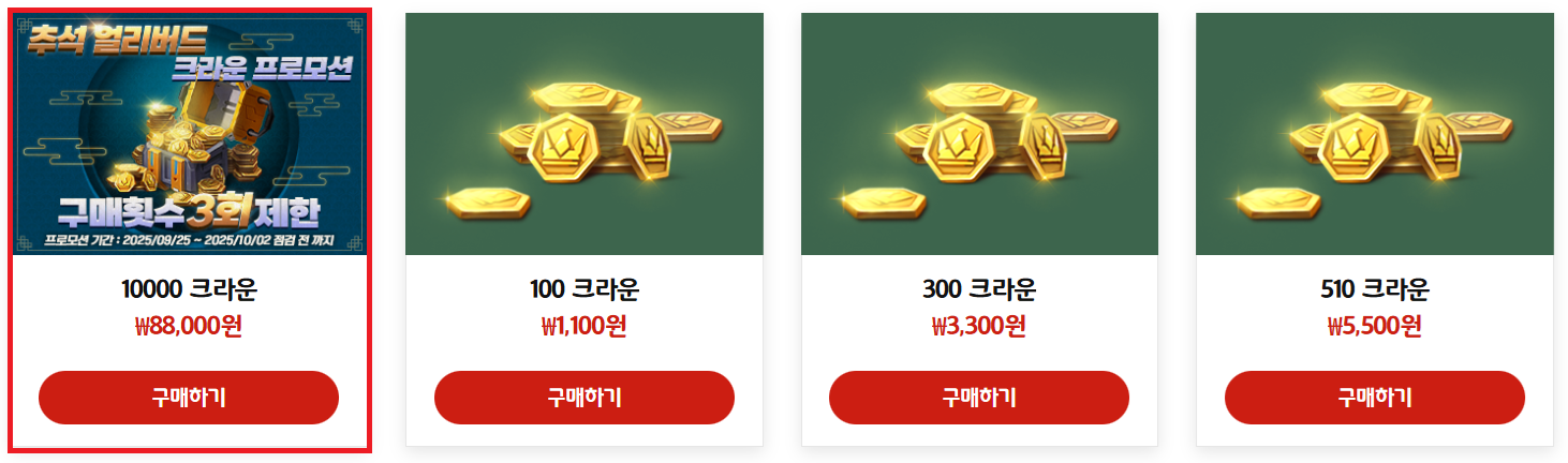 크라운 결제 프로모션 상품은 [공식 홈페이지] - [상점]에서 확인 가능합니다.