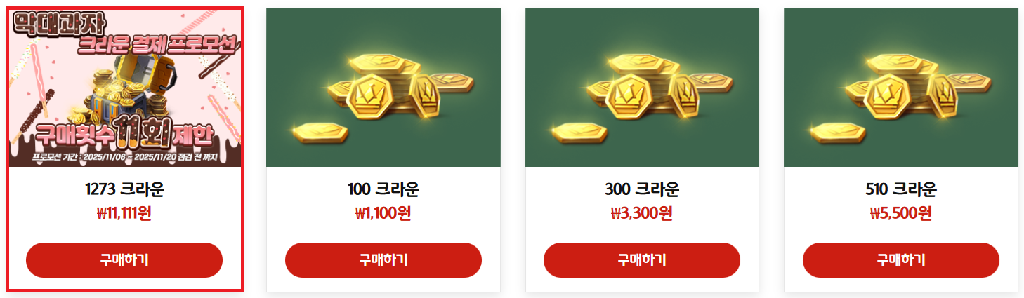 크라운 결제 프로모션 상품은 [공식 홈페이지] - [상점]에서 확인 가능합니다.