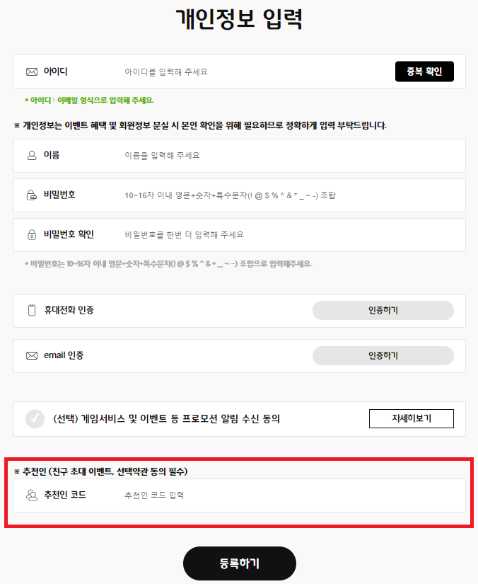 ※ 추천인 코드 기재는 “회원가입” 시에만 가능하며 기재 후 수정이 불가합니다.