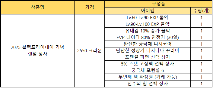 > [2025 블랙프라이데이 기념 랜덤 상자]의 자세한 확률은 확률공개 탭을 확인해 주시기 바랍니다.