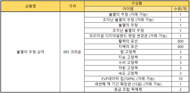 ※ 내용물 중 거래가능이 명시된 아이템 제외 모두 거래 불가입니다.