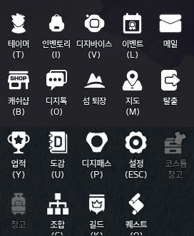 1. 퀵 메뉴에는 테이머, 인벤토리, 디지바이스, 이벤트, 메일, 캐쉬샵, 디지톡, 섬 입장(섬 퇴장), 지도, 탈출, 업적, 도감, 디지패스, 설정, 코스튬 창고, 창고, 조합, 길드, 퀘스트가 있습니다.