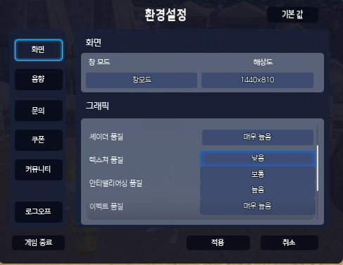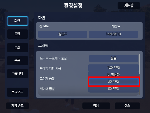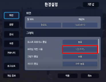 추가적으로 FPS 설정뿐 아니라, 그래픽 옵션을 상.중.하 로 설정 하시면 보다 쾌적하게 플레이 가능 합니다.