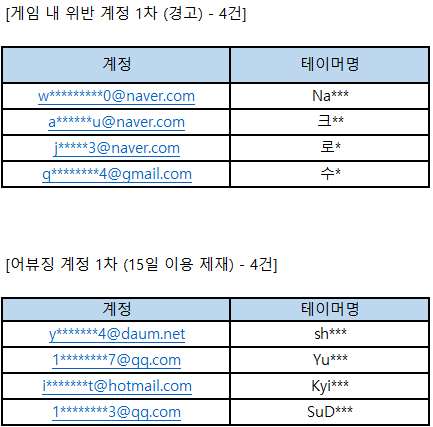 안녕하세요. 디지털 월드로 접속! <디지몬 슈퍼럼블> 입니다. 디지몬 슈퍼럼블 운영정책 위반 사유에 해당되는 계정을 공지 드립니다. 하단 리스트를 참고부탁드립니다. =================================================