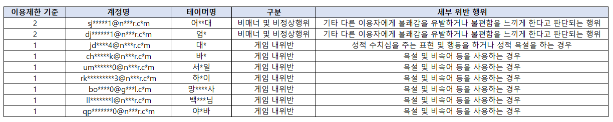 디지몬 슈퍼럼블 운영정책 위반 사유에 해당되는 계정을 공지드립니다. 하단 리스트를 참고 부탁드립니다.
