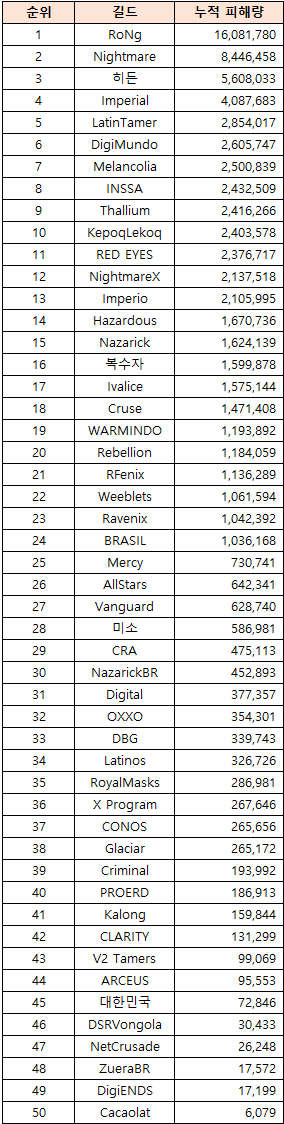 이에 따라 해당 서버의 길드 토벌전 순위를 안내 드립니다.