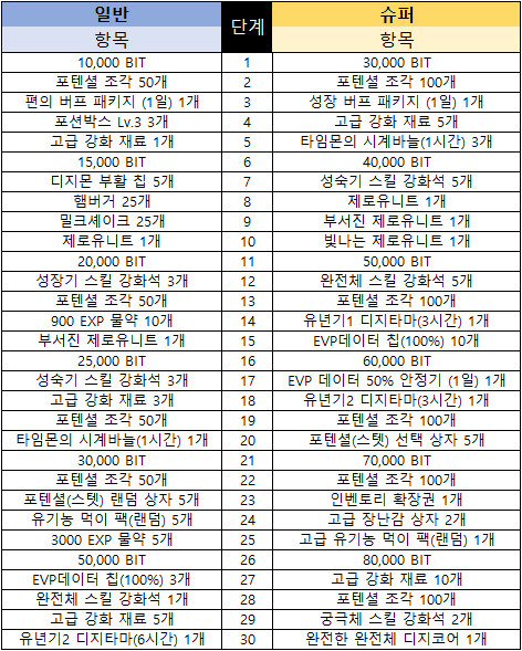 ※ 슈퍼 디지패스 보상 중, 3단계 [성장 버프 패키지 (1일)] 아이템은 거래 가능이나, 구성품은 모두 거래 불가입니다.