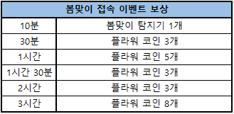 내용 : 이벤트 기간 동안 봄맞이 접속 미션 이벤트가 진행됩니다.